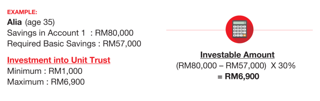 - Hanya 30% dari duit lebihan yang ada diakaun 1 selepas ditolak dengan syarat minimum yang telah ditetapkan.