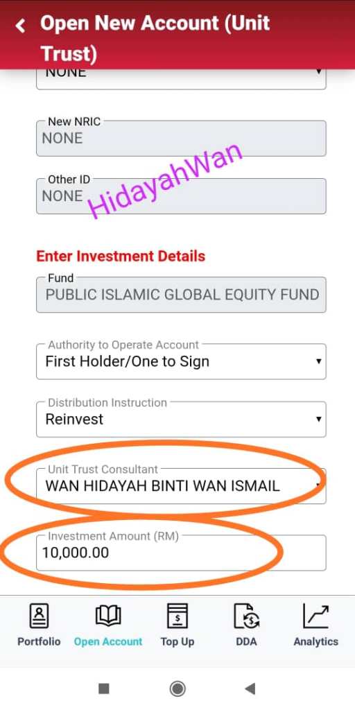 5. Kemudian masukkan sejumlah wang yang nak dilaburkan, jangan lupa untuk pilih nama unit trust consultant ye. Barulah pelaburan tu, boleh dipantau oleh HidayahWan. Ini baru pelaburan unit trust secara online.