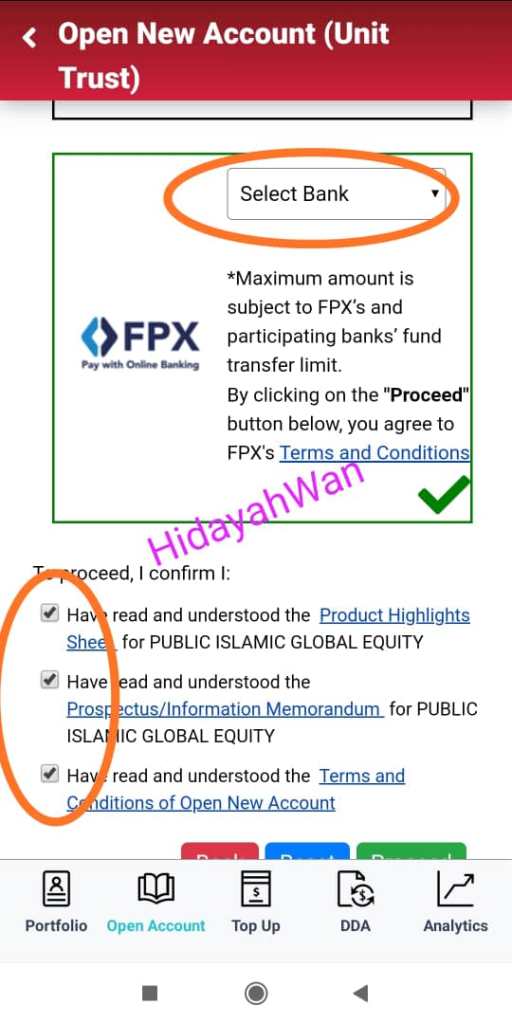 7. Seterusnya klik FPX untuk pilih banking online bank dan tik ke 3 kotak untuk I confirm.