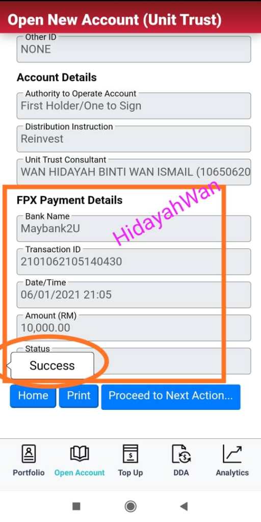 8. Selepas selesai di banking online, lihat di status mesti SUCCESS. Yes dah berjaya buka akaun pelaburan unit trust online dengan HidayahWan. Tahniah!