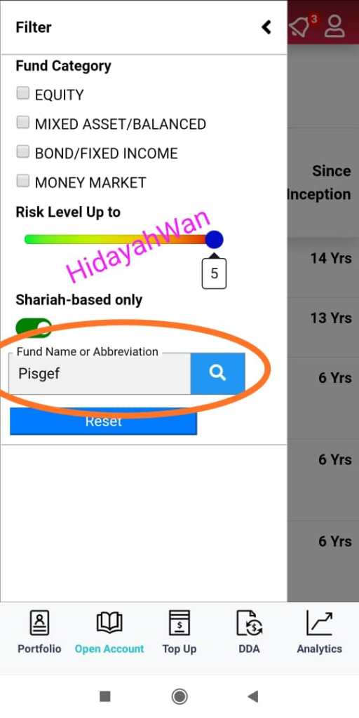 4. Klik Open Account dan taip nama fund. Macam mana nak tahu fund mana sesuai dengan objektif pelaburan saya? Tanya HidayahWan dan berbincanglah. Saya akan bagi free consultation. Jangan ikut cakap orang dengan kata fund ni bagus atau pun tidak, selagi tidak berbincang dan melihat sendiri prospektif fund tersebut sebelum melabur di unit trust.