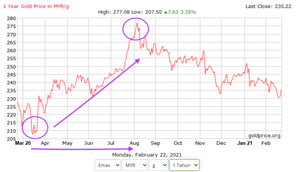 Refer chart kenaikan harga emas dalam tempoh setahun : Ali beli emas pada 1/4/2020 dengan harga RM210/gram. Katalah emas yang dibeli sebanyak 50gram. Ali menyimpan emasnya sehinggalah pada Ogos 2020 dan berjaya menjual emasnya pada nilai tertinggi RM275/gram. Jom kita kira: