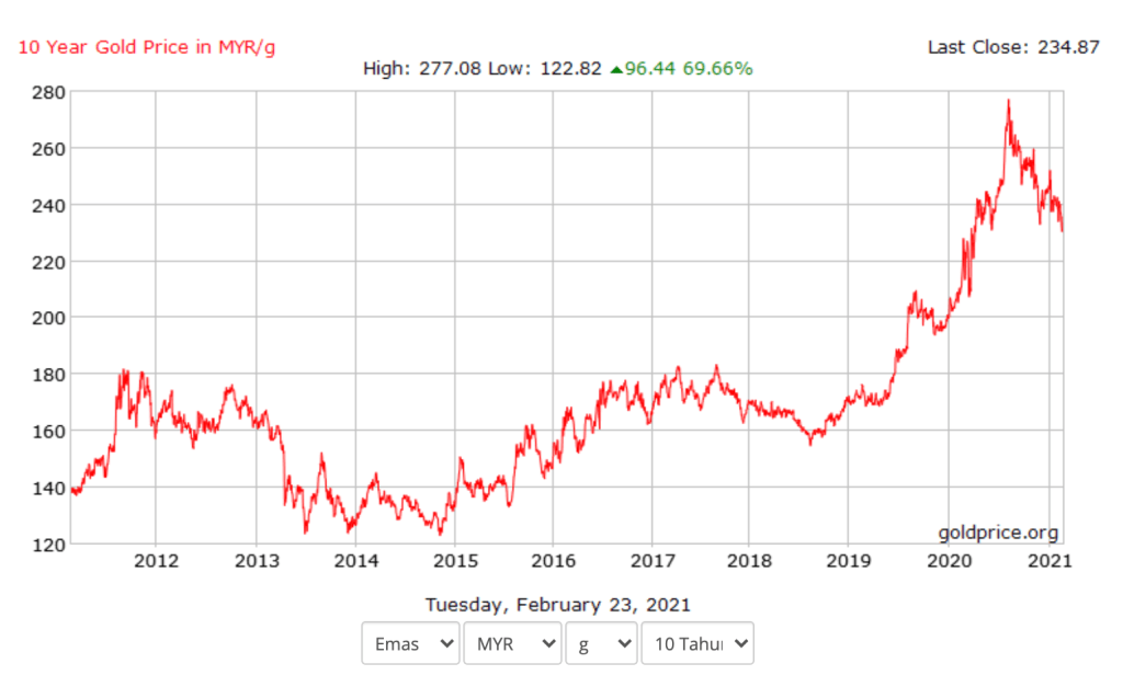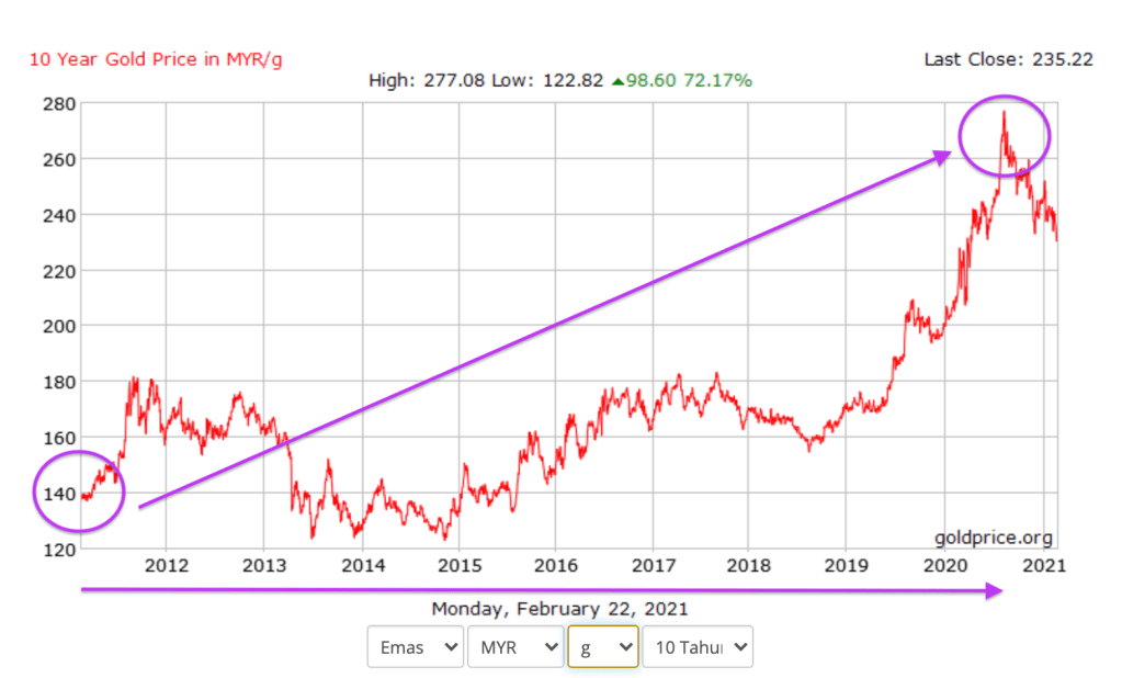 Refer chart kenaikan harga emas dalam tempoh 10 tahun : Ali beli emas pada 2011 dengan harga RM140/gram. Katalah emas yang dibeli sebanyak 50gram. Ali menyimpan emasnya sehinggalah pada Ogos 2020 dan berjaya menjual emasnya pada nilai tertinggi RM275/gram. Jom kita kira: