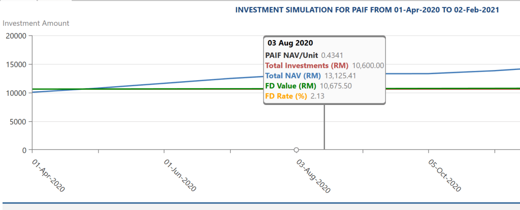 Keuntungan 30.63%, maka nilai wang Ahmad jadi RM13,125.41. Keuntungan Ahmad adalah sebanyak RM13,125.41 – RM10,600.00 = RM2525.41. Refer investment simulation dibawah untuk lebih faham. Faham pelaburan unit trust lebih dalam disini