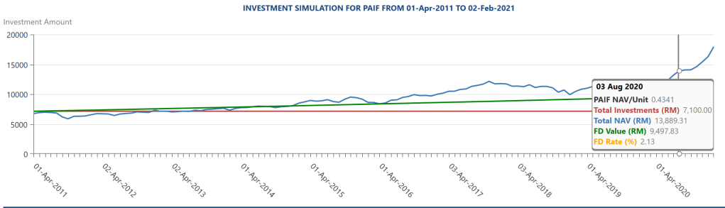 Daripada simulasi ini, keuntungan Ahmad adalah sebanyak RM13889.31 – RM7100 = RM6789.31(Keuntungan ini adalah termasuk service caj pada permulaan pelaburan) selama 10tahun.