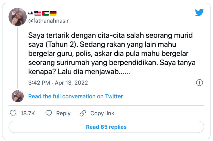 Dah jadi viral pulak, kisah pelajar di tahun 2, punya cita-cita nak jadi surirumah yang berpendidikan ni. Sampaikan cikgunya pun terkejut. Tahniah anak! awak ada cita-cita yang sama dengan Hidayahwan nak jadi surirumah yang berpendidikan.